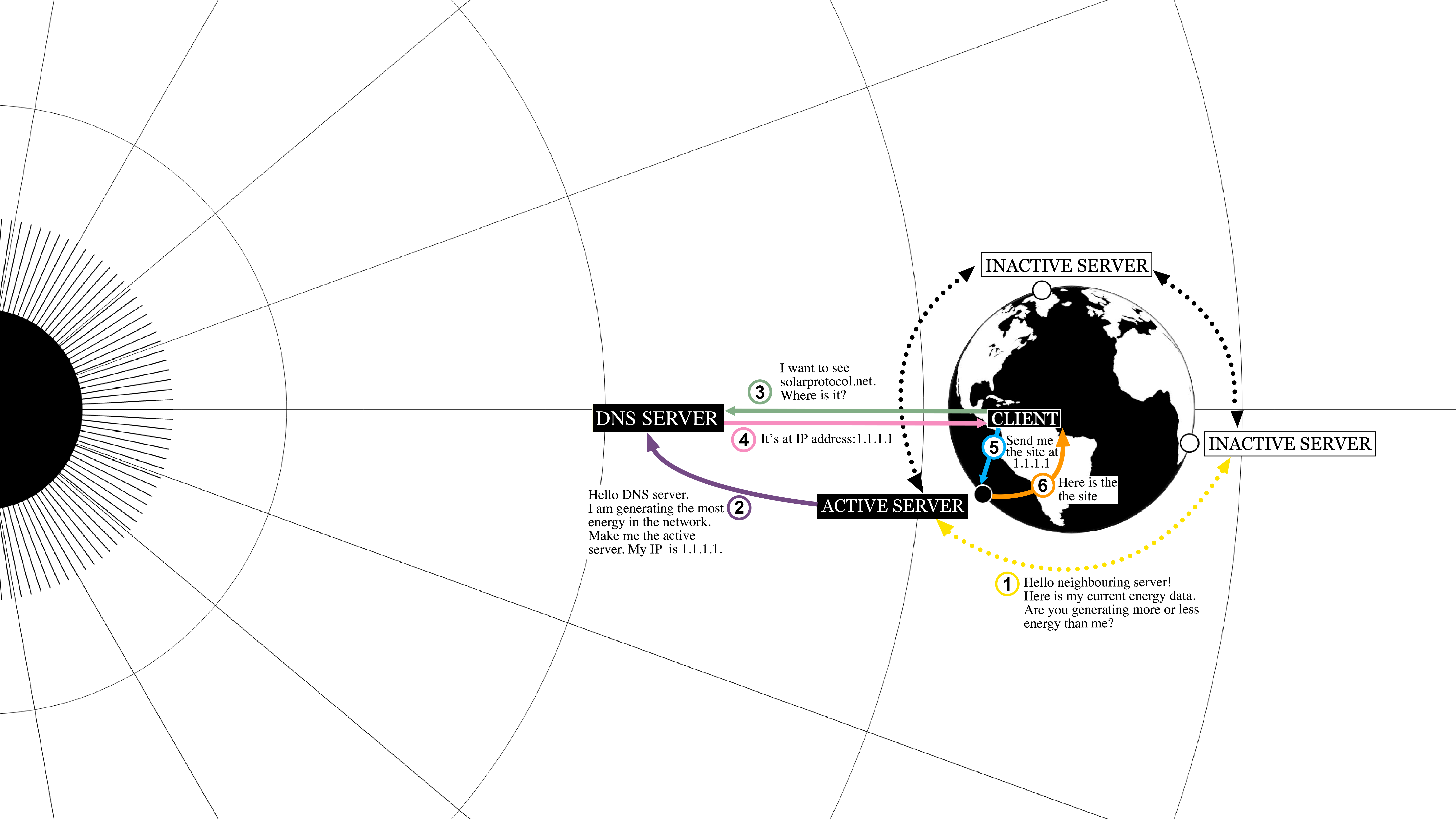 Solar Protocol utilise la répartition de la lumière solaire à la surface du globe comme logique déterminant le déploiement du réseau et son fonctionnement. Le projet explore ainsi une forme d’« intelligence naturelle », par opposition à l’intelligence artificielle. En se basant sur les dynamiques environnementales, le projet remet la question de l’énergie et ses limites au centre du processus de design.